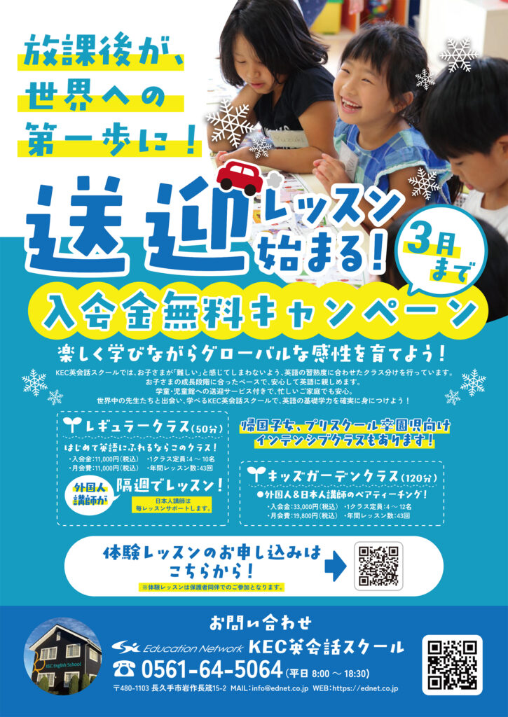 KEC英会話スクールでは、長久手北小学校に通われているお子様向けに、4月より学童保育所・児童館への送迎付きレッスンを開始いたします。英語を始めたいけど、送迎が難しいとお考えの保護者様は、ぜひKEC英会話スクールの送迎付きレッスンをご利用ください。